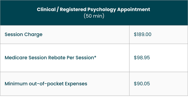 Please see below the following fees and rebates for psychology appointments under a Mental Health Care Plan: